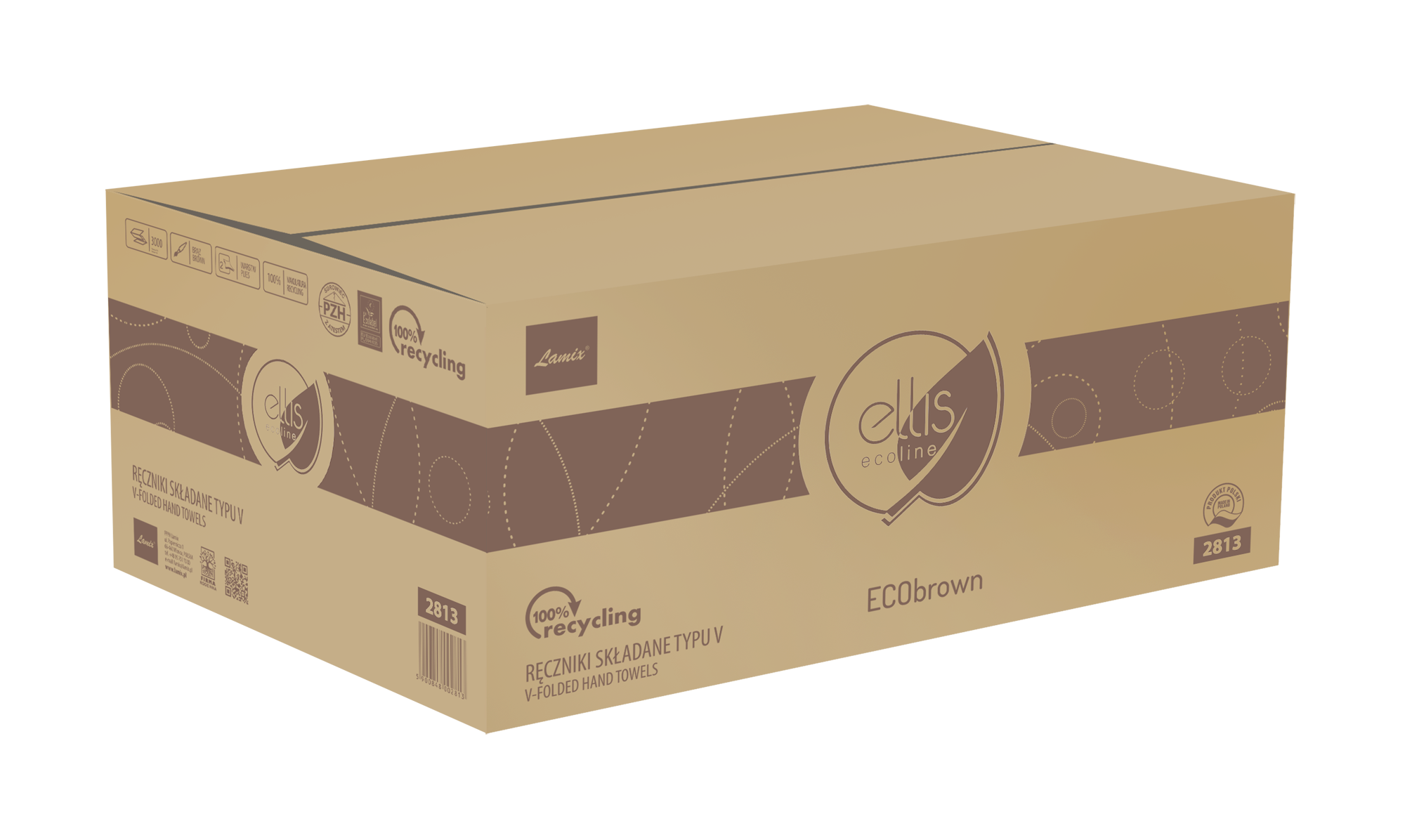 Makulaturowy, dwuwarstwowy i klejony ręcznik składany do użytku profesjonalnego w pomieszczeniach o zwiększonym natężeniu użytkowania; ręcznik z unikatowym wzorem gofrowania.