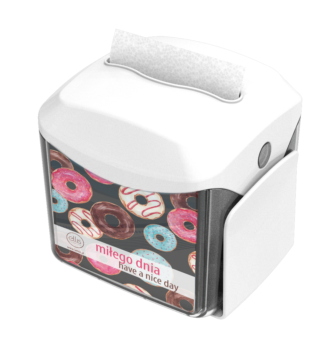 Podajnik wyposażony w mechanizm wypychający serwetki. Oba dłuższe boki mają możliwość umieszczenia spersonalizowanej wkładki. Dodatkowa zakładka z boku umożliwia umieszczenie oferty papierowej. Kompatybilny z serwetkami 1045